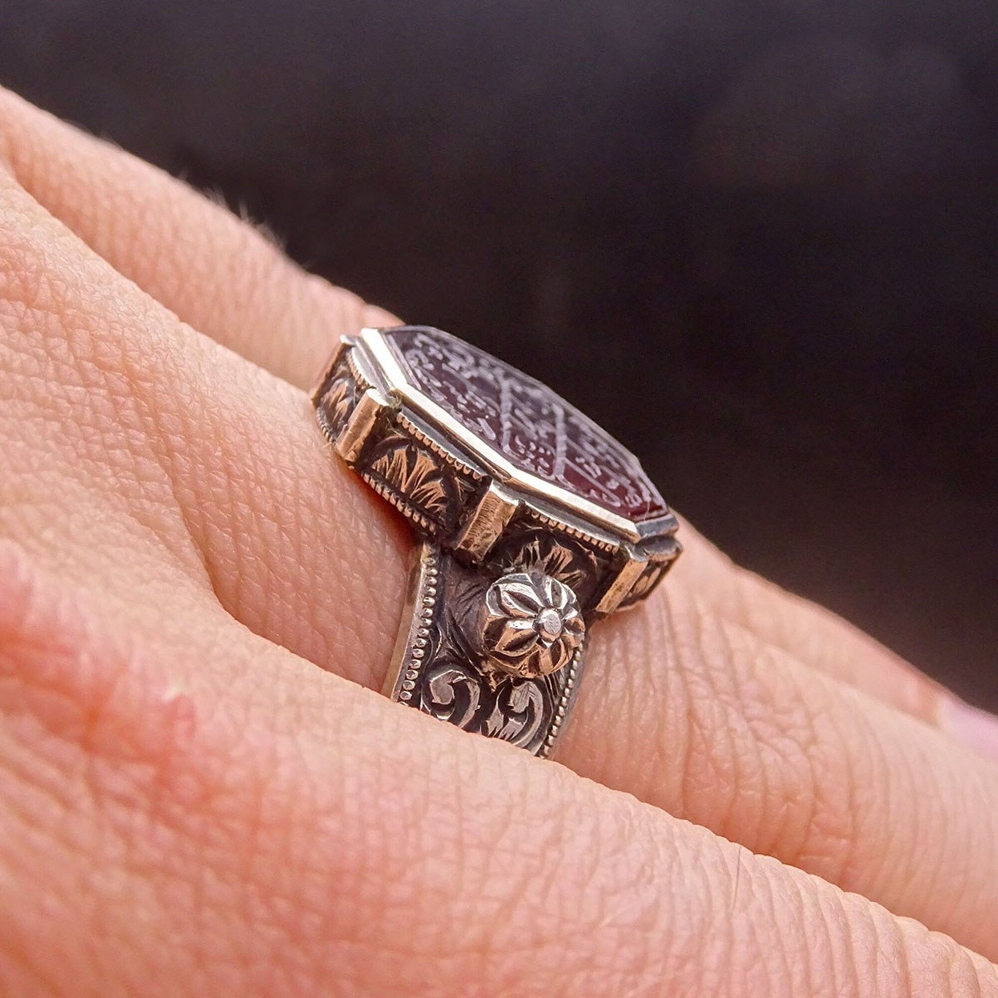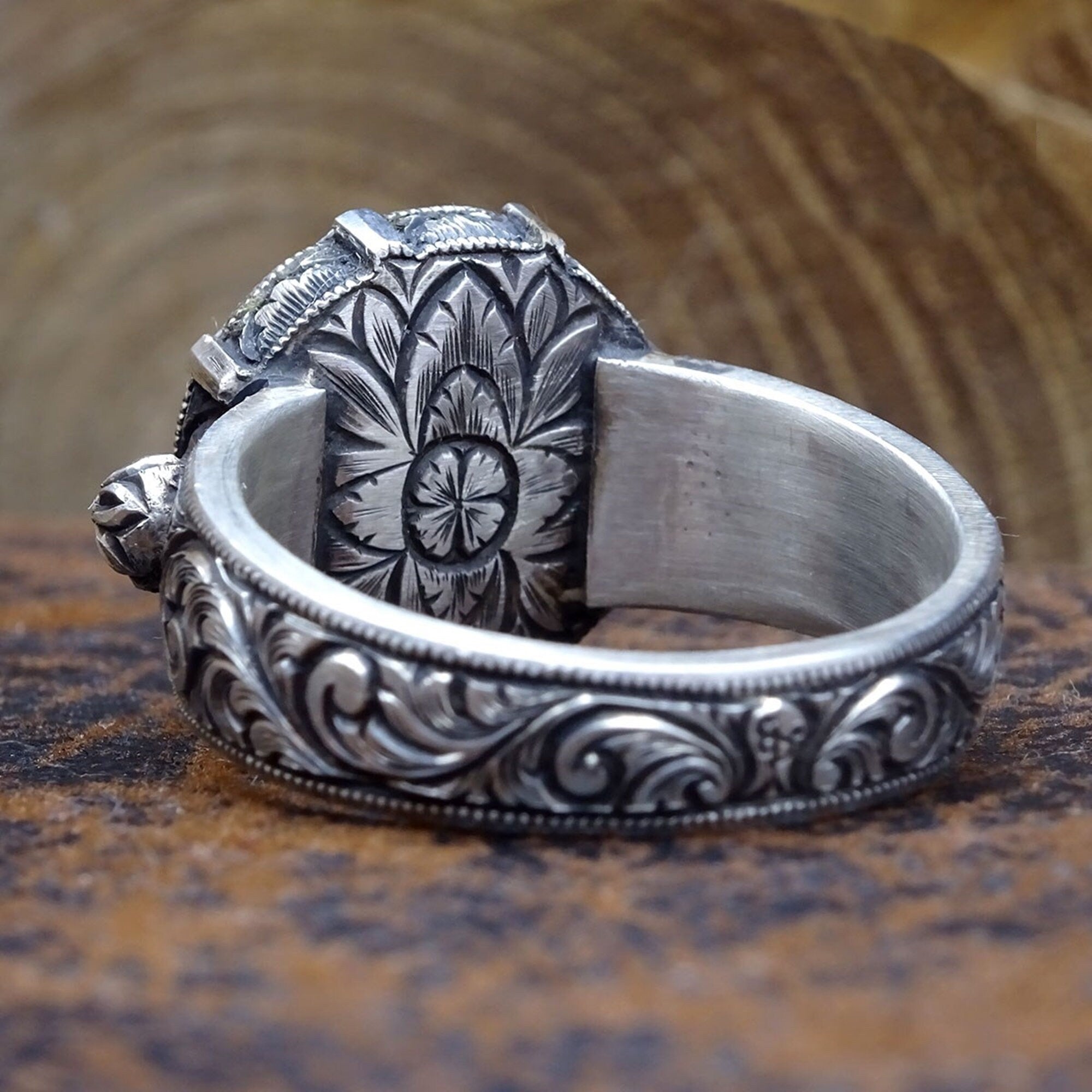 Прекрасен прстен модел од Колекцијата Февкаладе, со рачно изработена футрола направена целосно од сребрена маса, а потоа и рачно изработени мотиви.